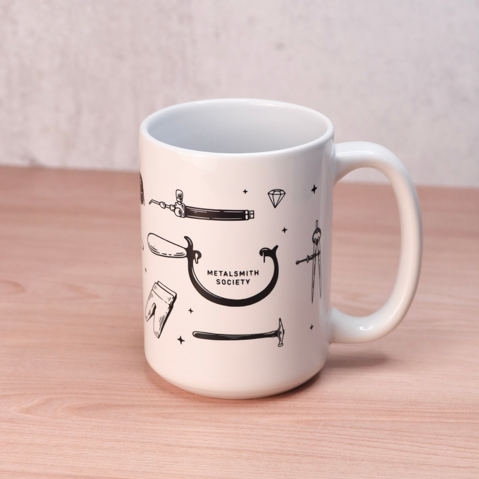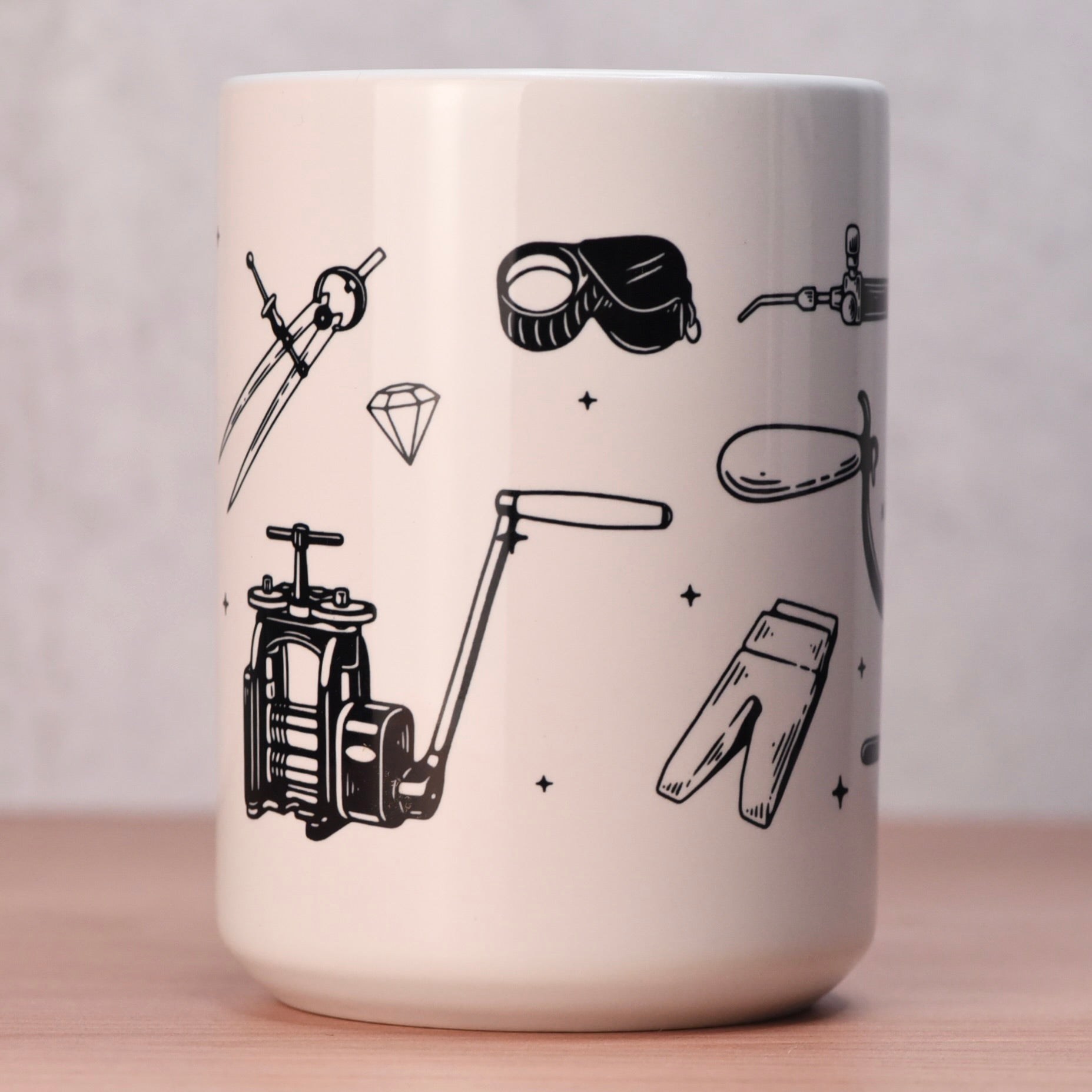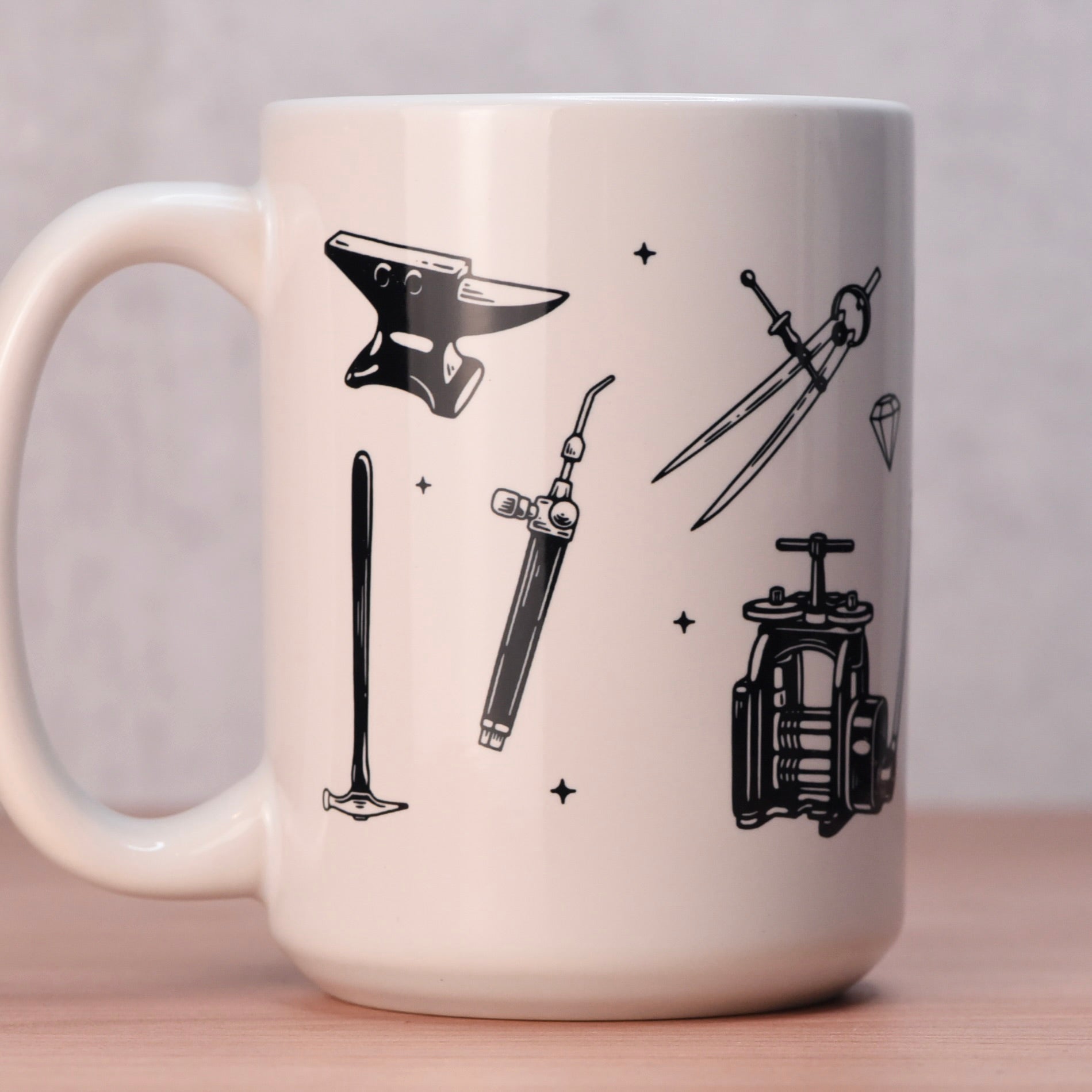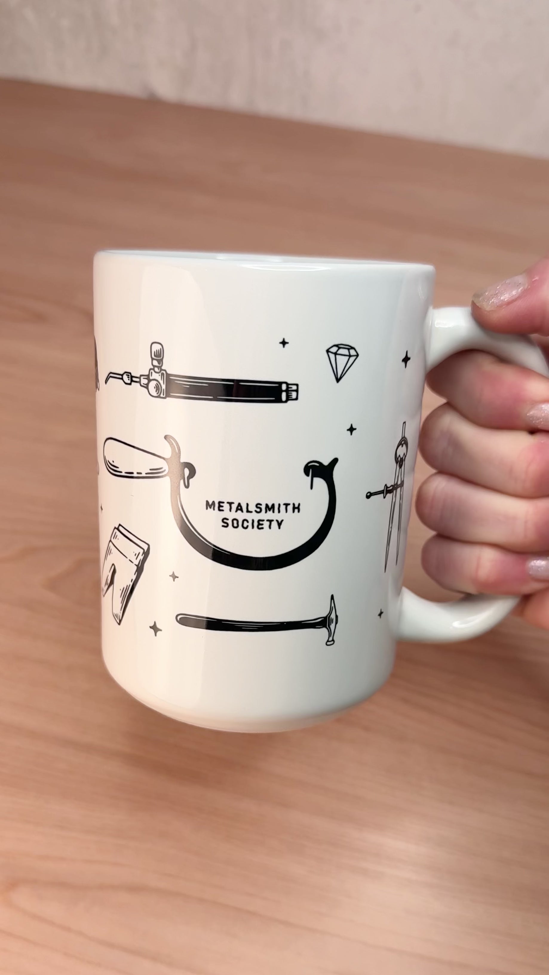 Designed by @butterystudio, this 15oz ceramic mug features illustrated jewelry-making tools and metalsmith essentials — a little nod to the tools of our trade and the craft we all love. Whether you’re fueling up with morning coffee at the bench, winding down with evening tea, or taking a mid-studio break, this mug is made for jewelers, metalsmiths, and makers alike.